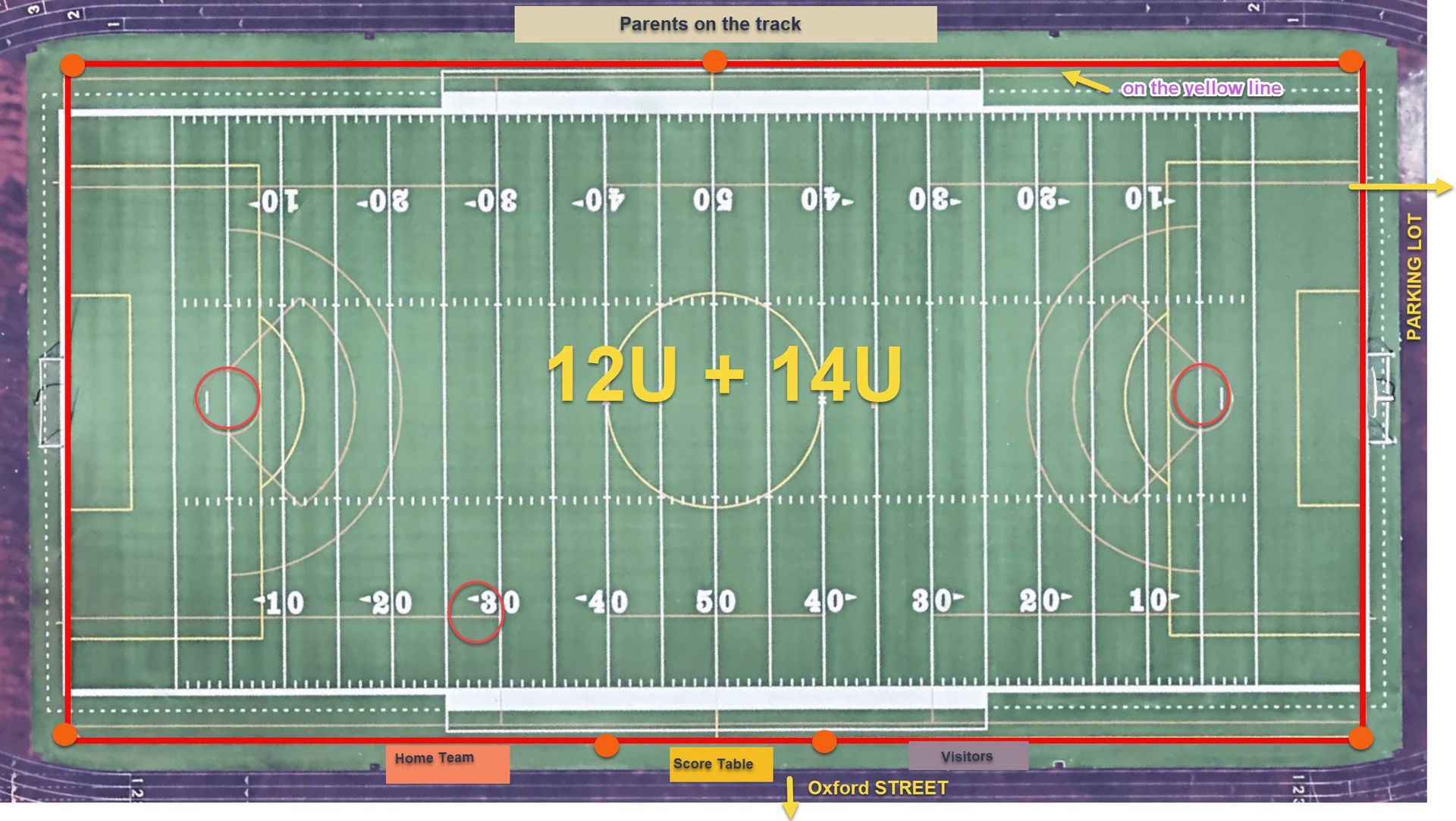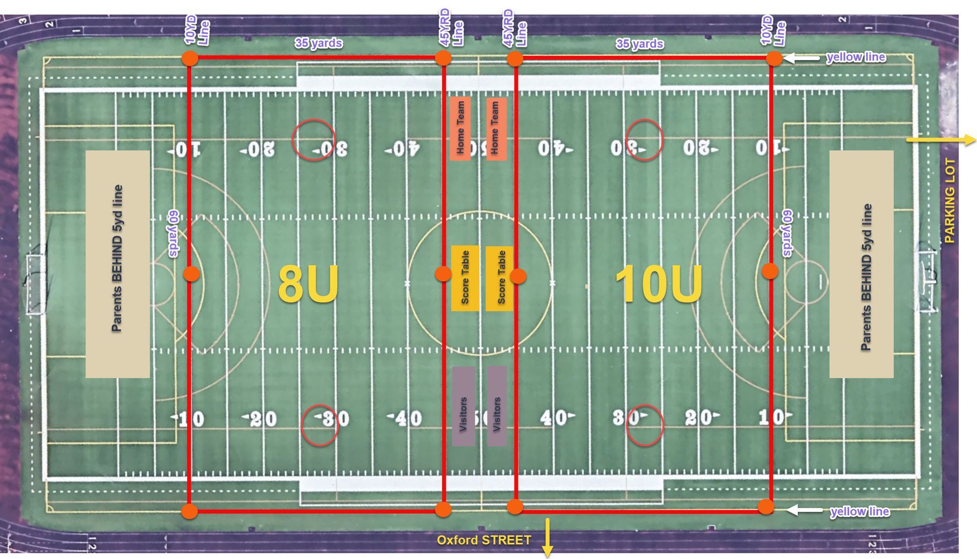 - Use orange cones - six per field for all corners and midfield