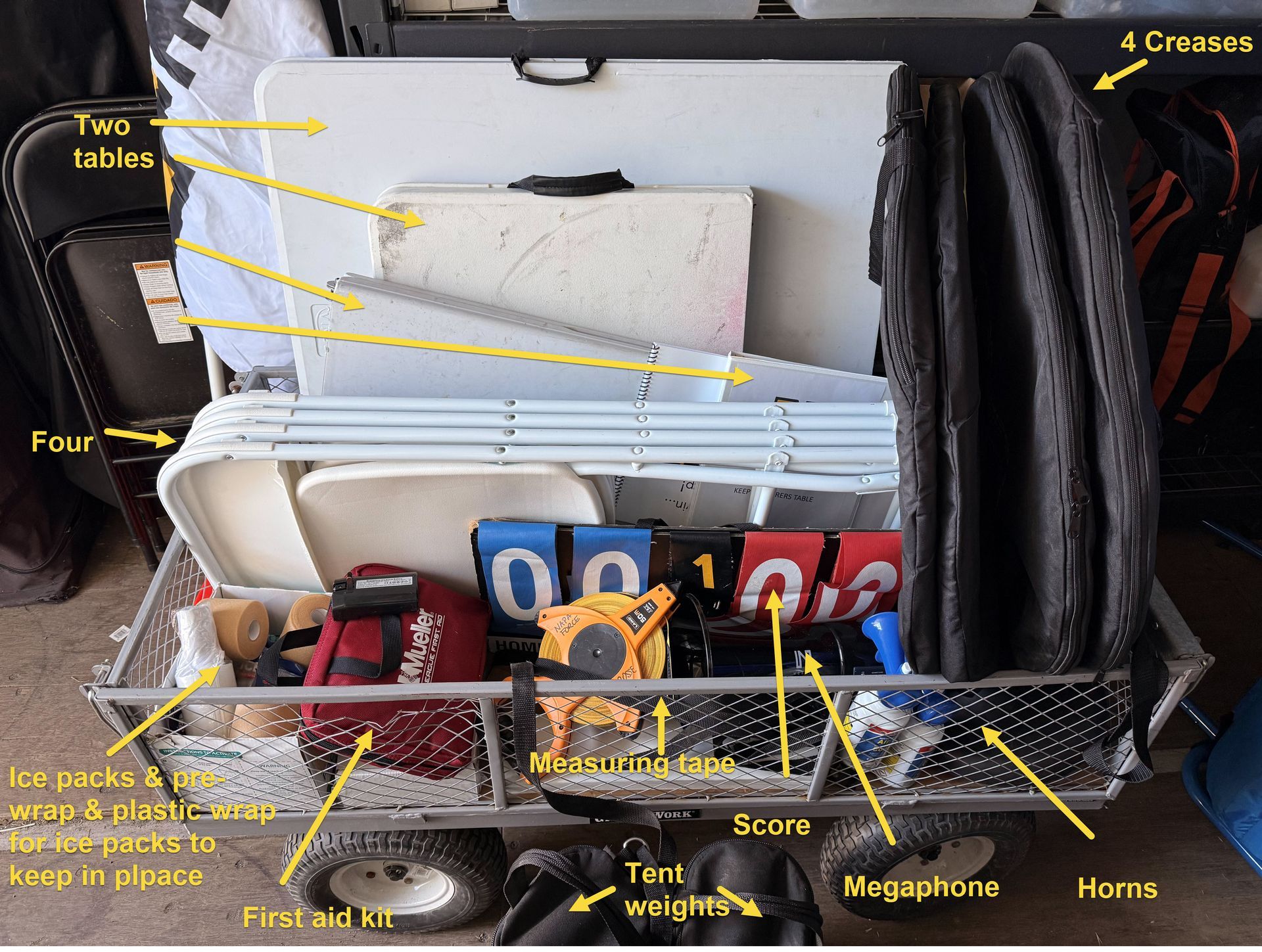 - 4 creases (these must be put back in their bags and put back on the wagon after 8U/10U games)